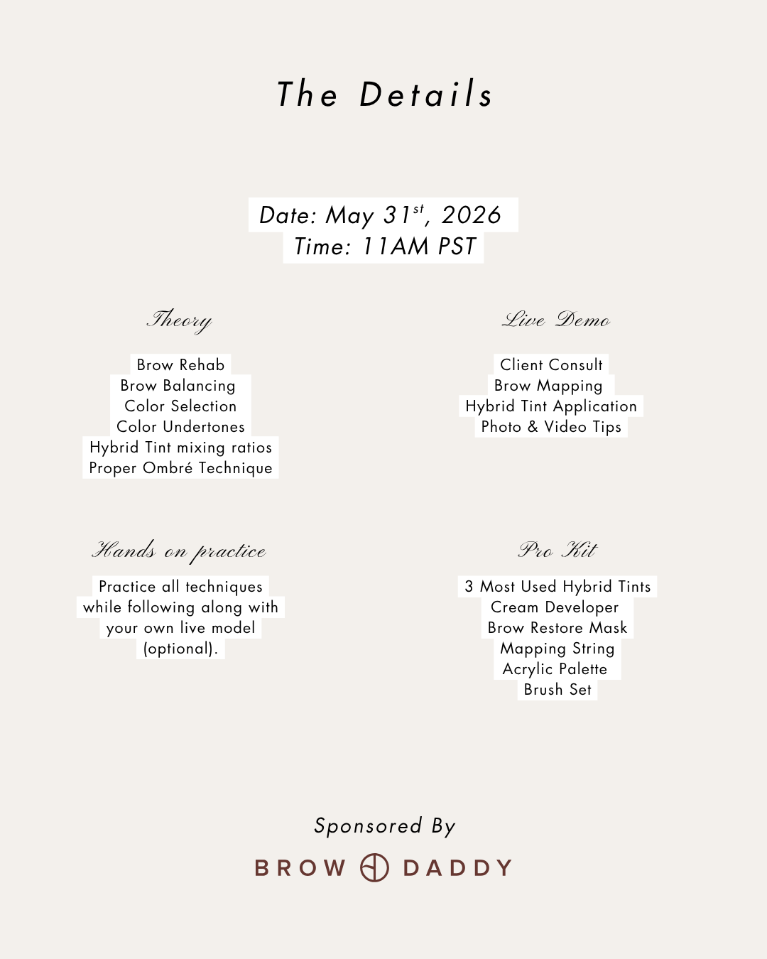 This virtual training is perfect for anyone looking to join the brow industry, as well as experienced artists ready to learn new techniques and refine their skills. You’ll learn how to confidently map brows for any face shape and create flawless hybrid tint results that keep clients coming back.